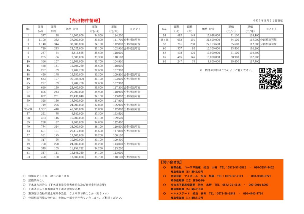 可児市羽生ヶ丘団地内にて3宅地を下記の通り分譲します。(詳しくは物件情報にてご確認下さい。8月8日更新)