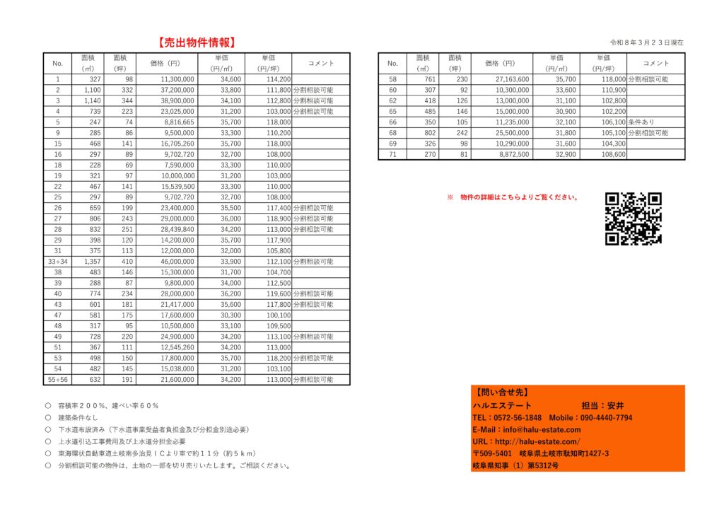 可児市羽生ヶ丘団地内にて2宅地を下記の通り分譲します。(物件情報にてご確認下さい。3月12日更新)