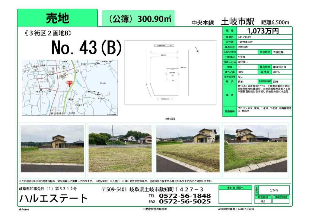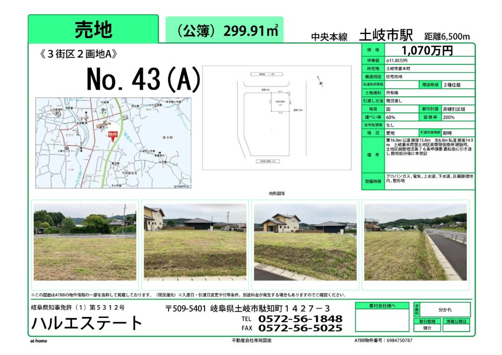 土岐市妻木南部区画整理事業の住宅用地の物件を新しく追加しました。(物件情報4月3日更新)
