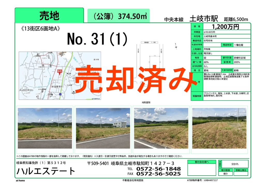 【売却済み】土岐市区画整理土地No.31_13街区6画地Aを売り出します