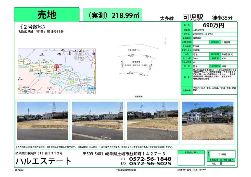 可児市羽生ヶ丘団地で住宅用地・2号敷地を値下げします。