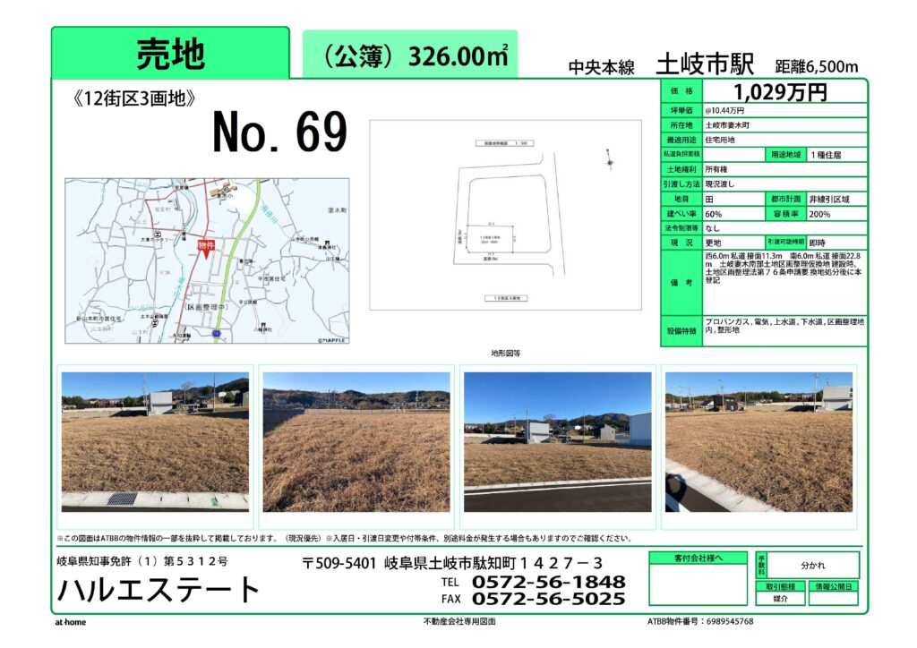 土岐市区画整理土地No.69_12街区3画地を売り出します